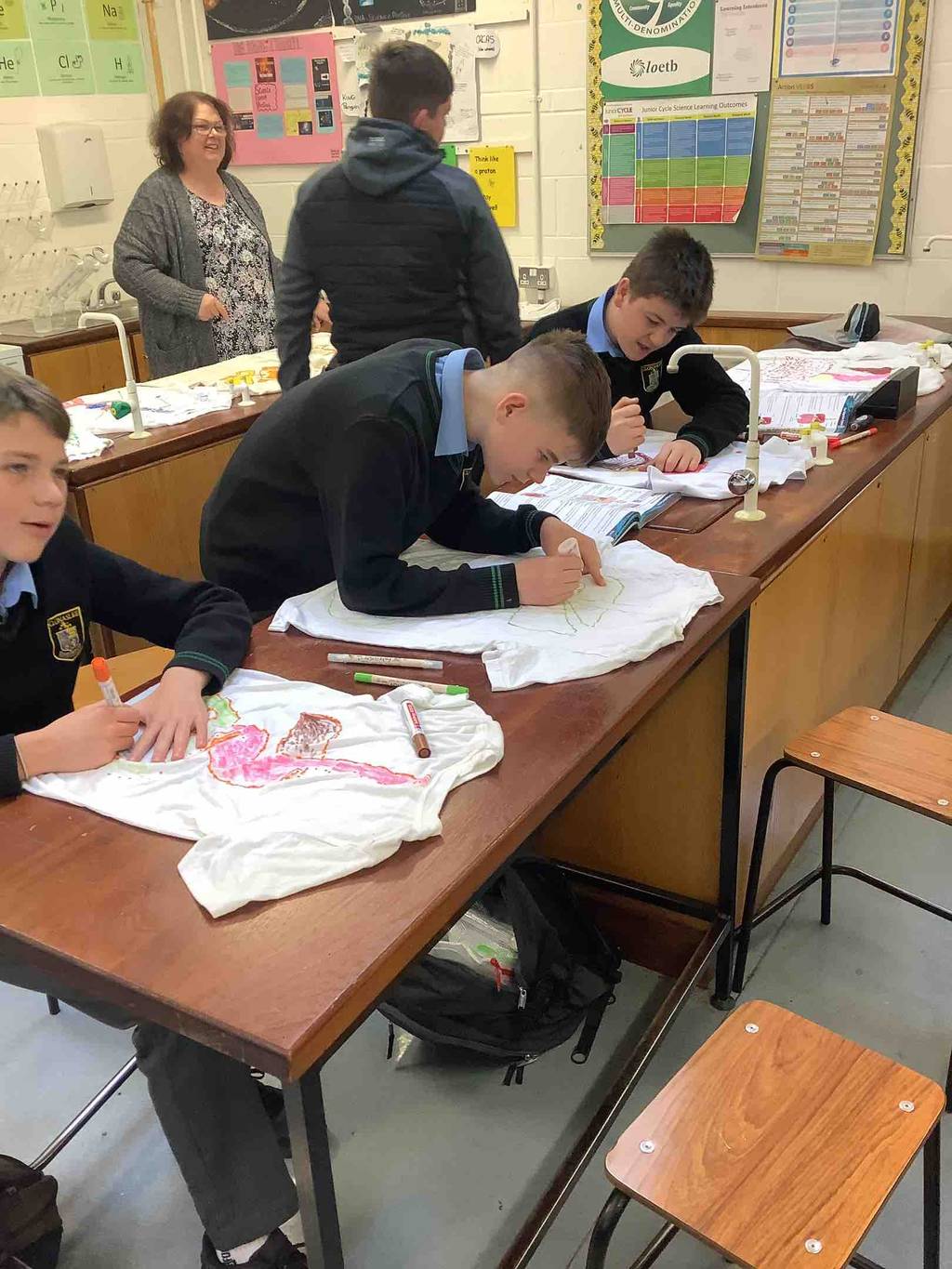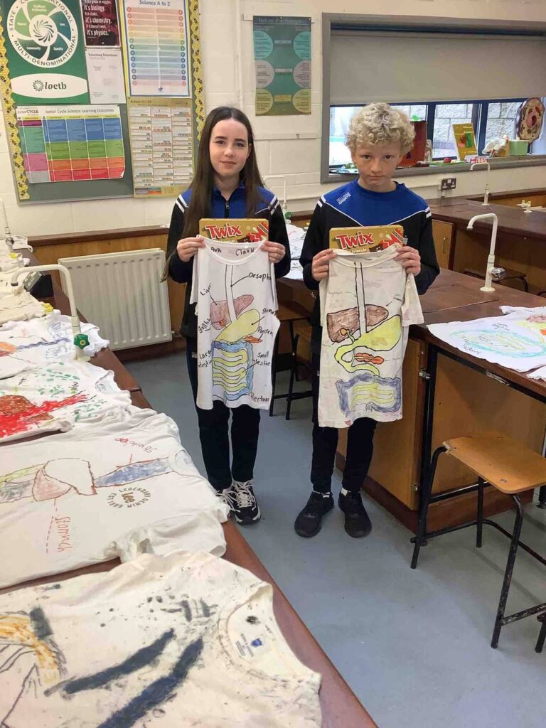 For Science Week, our First Year students employed some key Junior Cycle skills by upcycling old t-shirts to illustrate the human digestive system. We can see from the pictures they made a great effort to be both creative and scientifically accurate. Well done to all for their fantastic work and congratulations to our well deserved winners, Robbie and Ava!