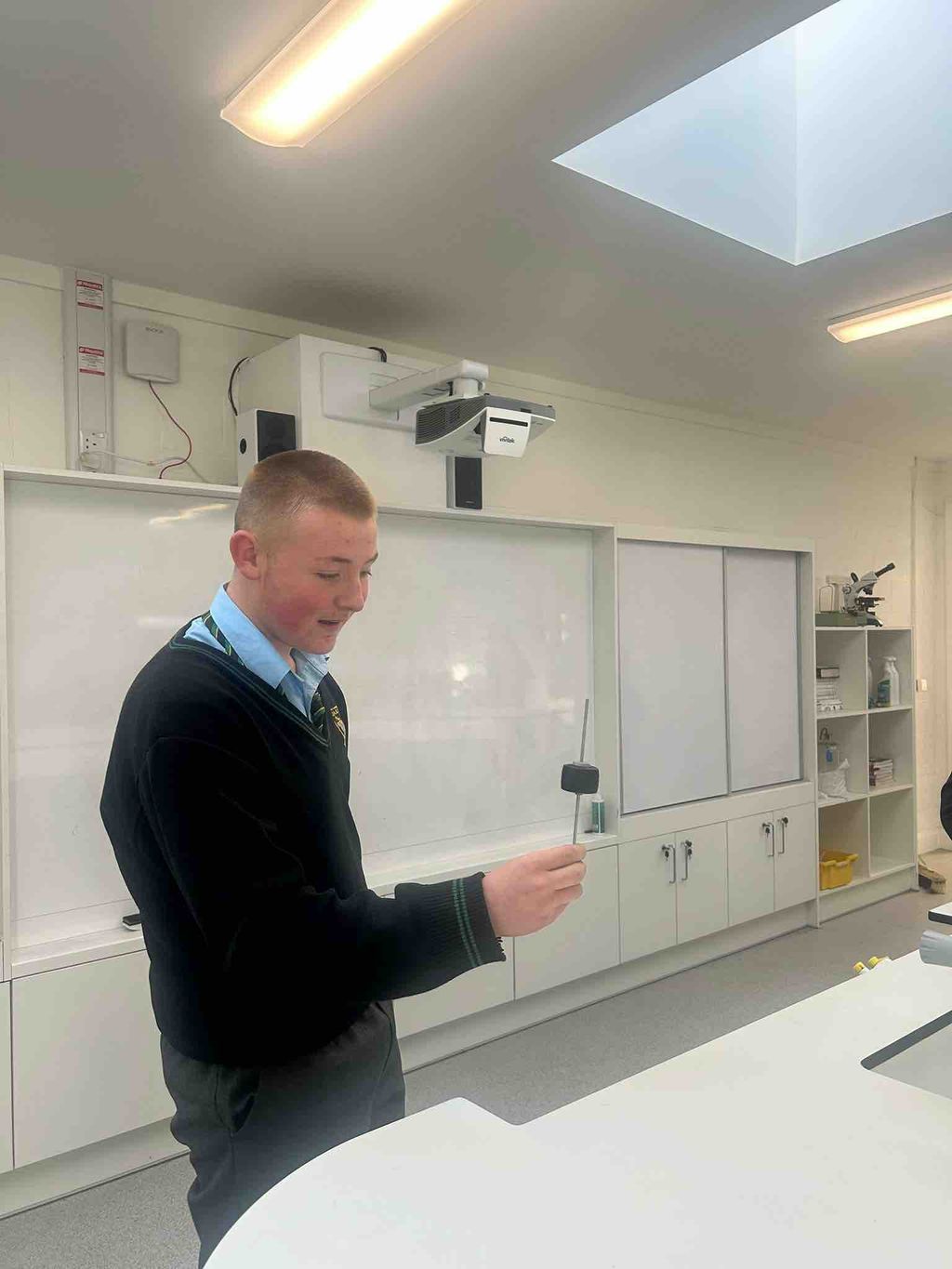 As part of Science Week, our Third Year students were challenged to design and build their own Energy Transfer Devices. TY students Mary Kate and Cadhla took their judging roles very seriously, testing each invention carefully.