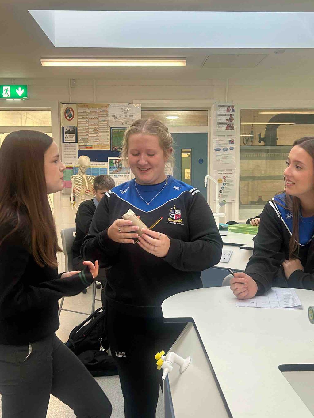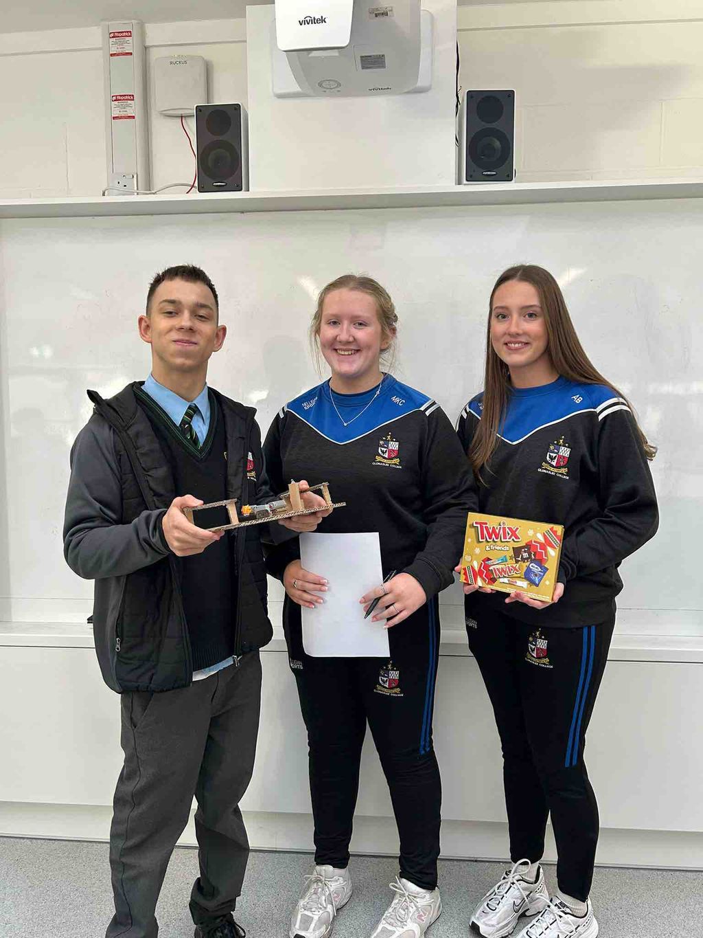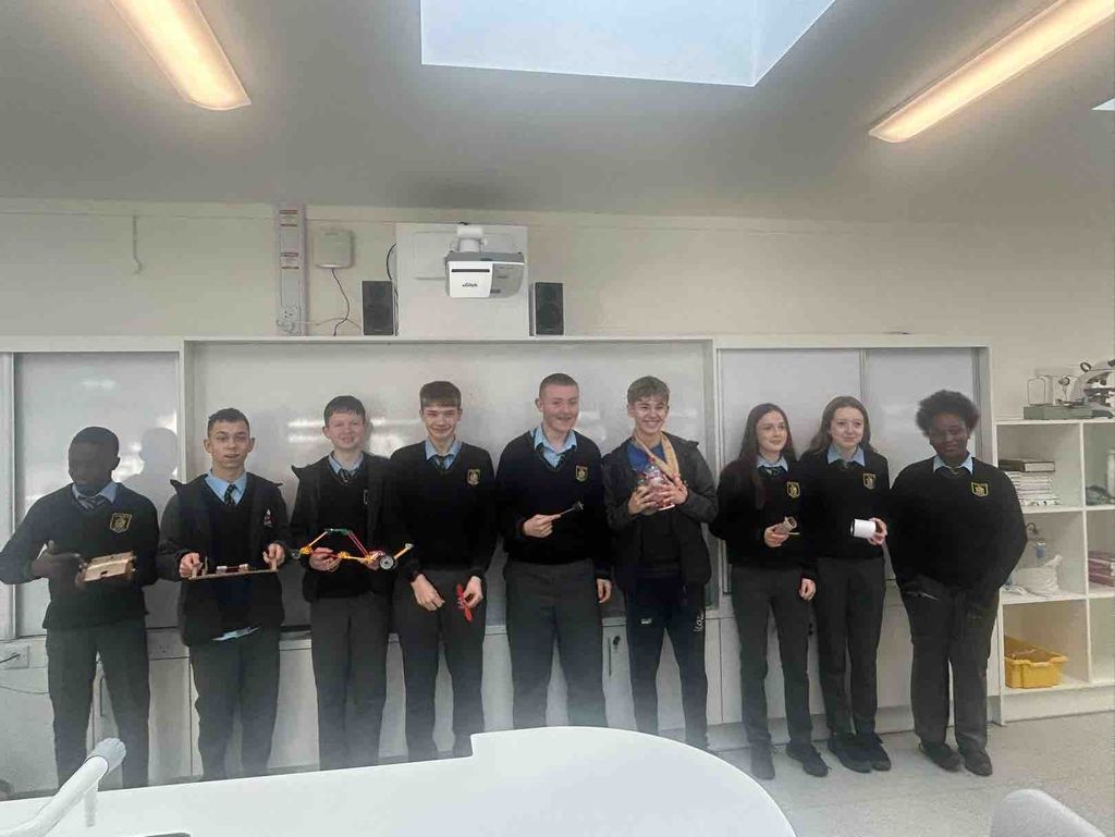 As part of Science Week, our Third Year students were challenged to design and build their own Energy Transfer Devices. TY students Mary Kate and Cadhla took their judging roles very seriously, testing each invention carefully.