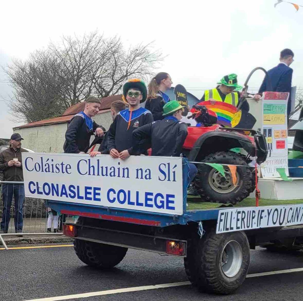 The Clonaslee St. Patrick’s Day Parade returned this year for its fifth year running. Our Transition Year students took part with a float inspired by a hot topic of conversation — rising fuel costs. There was great fun in the lead-up to the parade, planning and designing the float, as well as getting involved on the day itself.
