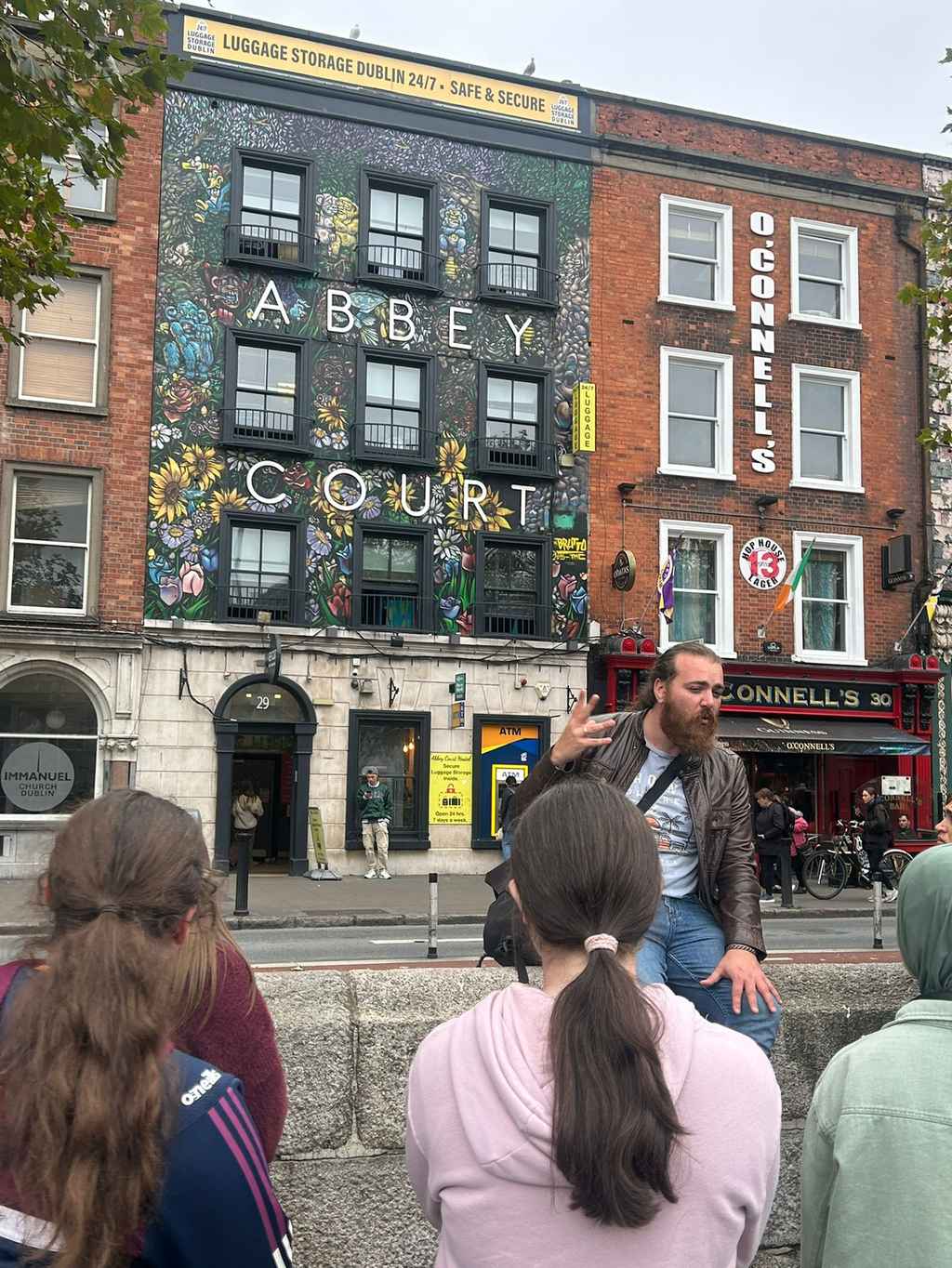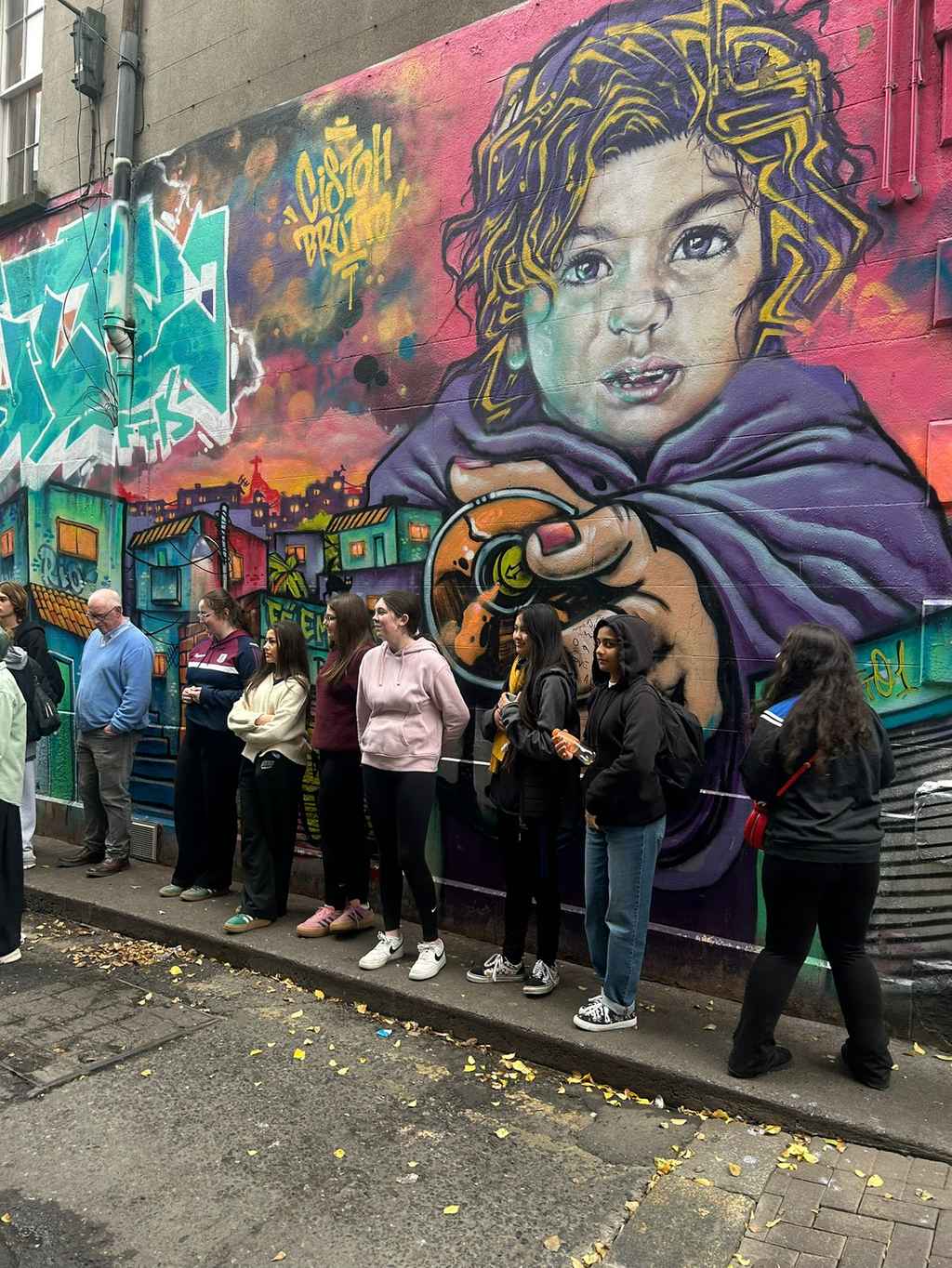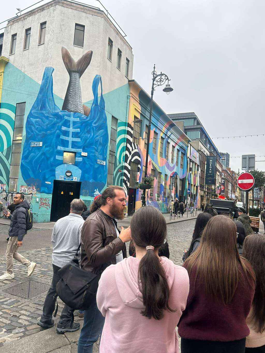 Our Senior Art students visited Dublin city centre this week for a fascinating Alternative Dublin tour of the city’s street art. Liam, our guide, was incredibly engaging as he led students through some of Dublin’s most memorable and striking pieces, including the impressive mural at Blooms Hotel in Temple Bar.
