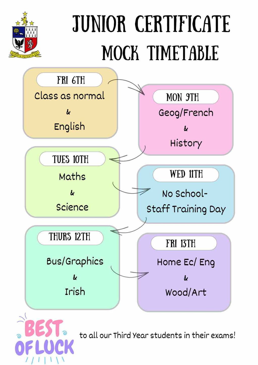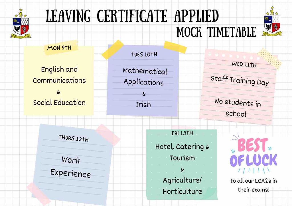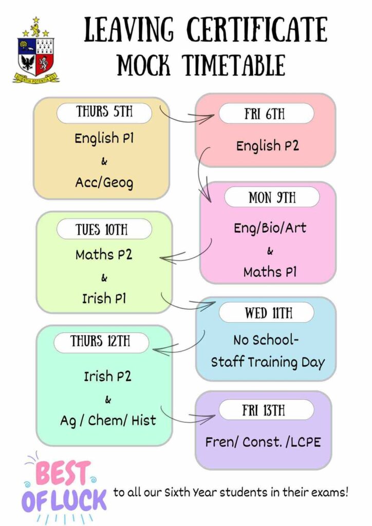 We’d like to wish all our 6th Year, LCA2 and 3rd Year students the very best of luck in the days ahead. Preparation is key, so make sure to screenshot your timetable and arrive each day with all required materials.