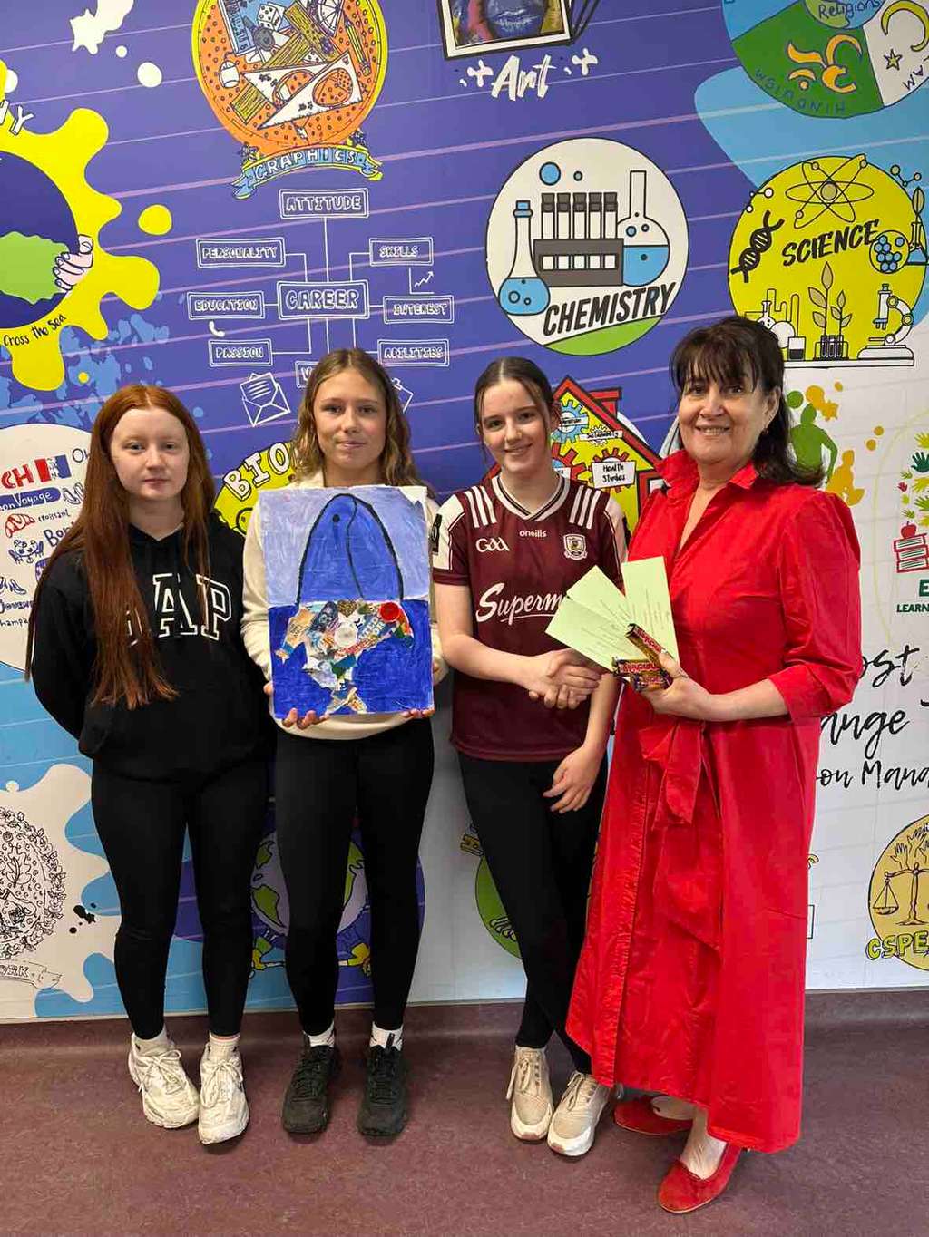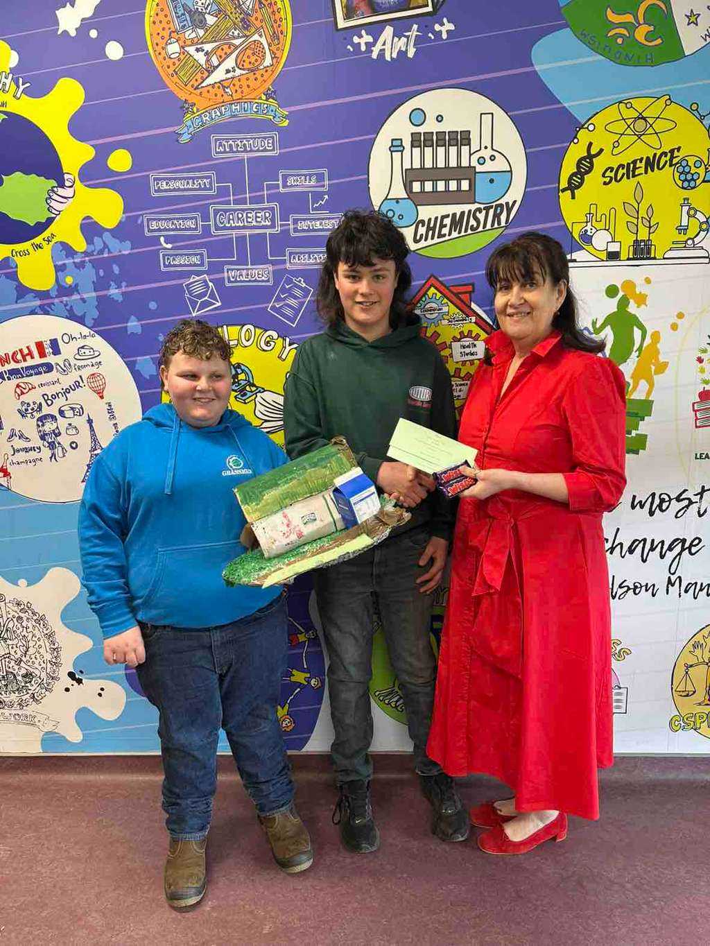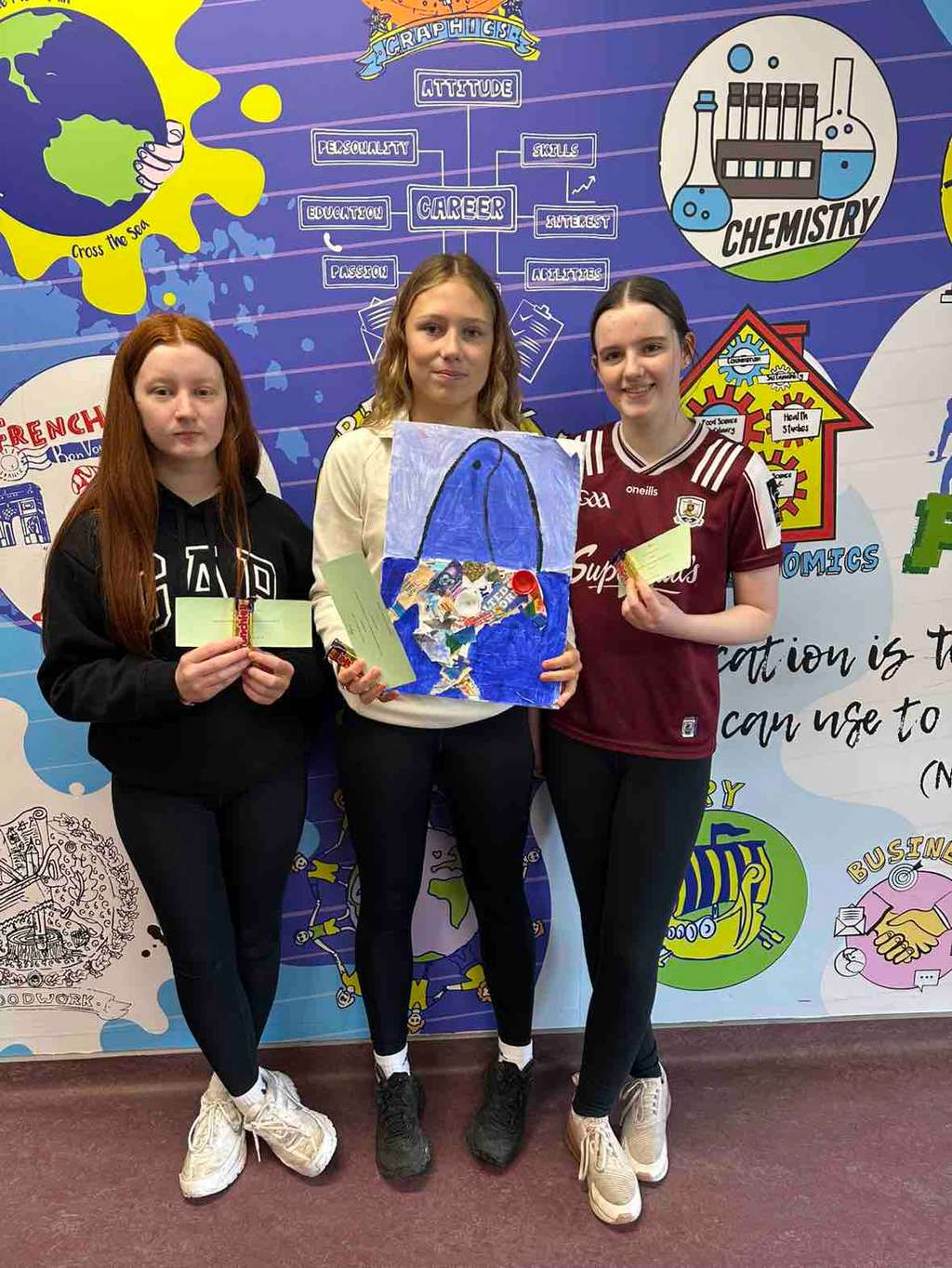 In first year, Ned and Cathal took first place in the Waste‑to‑Art competition with their impressive functional barn, created under tight time pressure. In 2A, Kayla, Michaela and Isabelle wowed the judges with a piece highlighting the harmful impact of waste on marine life. They created a fish whose stomach was filled with waste, symbolising pollution in our oceans. In 2B, Sarah and Shannon produced a sculpture of a man, made entirely from waste materials.