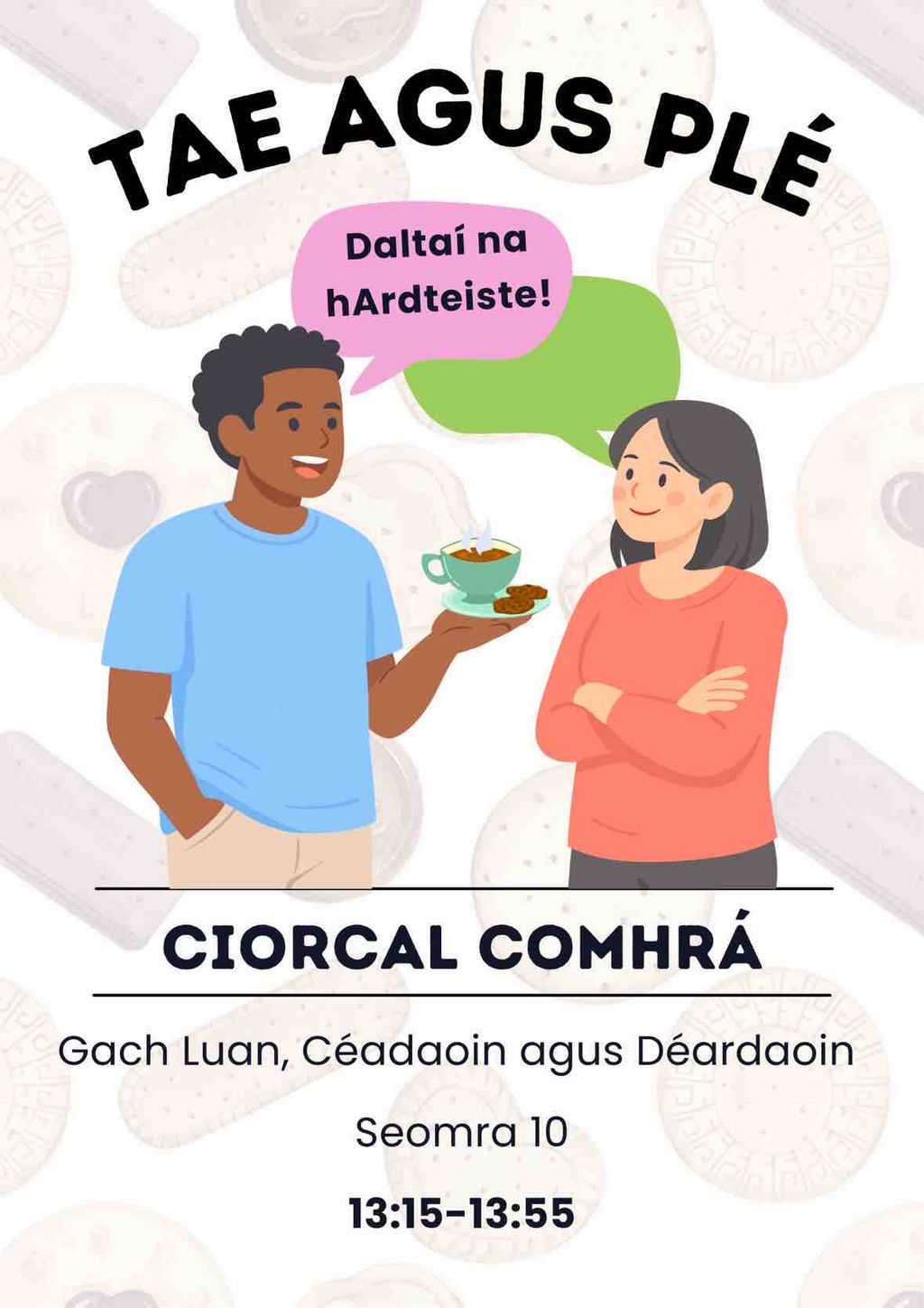 With only a few weeks to go before the Irish oral exams, it’s time to get practising. Head into Room 10 at lunchtime on Monday, Wednesday and Thursday (13:15–13:55) to practise your Irish in a relaxed setting.